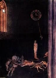 —At midnight, a new guest appears, dressed more ghoulishly than his counterparts. His mask looks like the face of a corpse, his garments resemble a funeral shroud, and his face reveals spots of blood suggesting that he is a victim of the Red Death.”